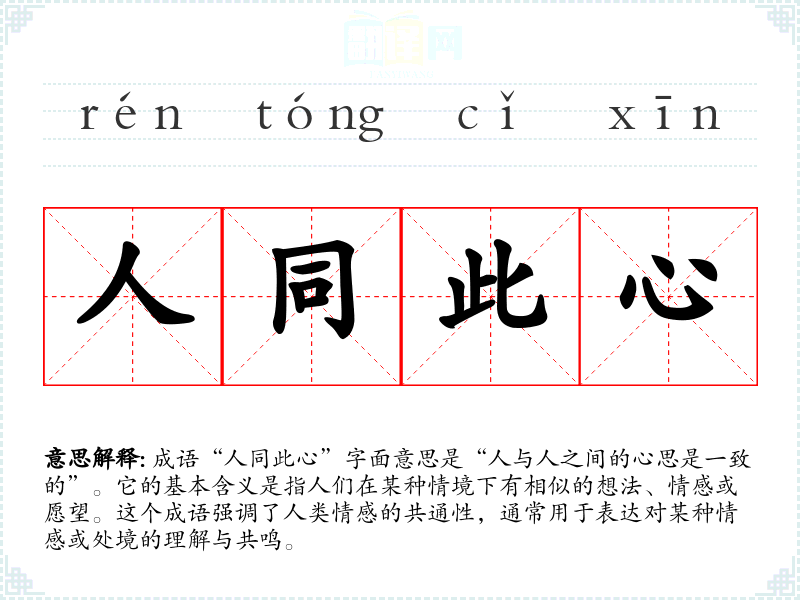 成语“人同此心”字面意思是“人与人之间的心思是一致的”。它的基本含义是指人们在某种情境下有相似的想法、情感或愿望。这个成语强调了人类情感的共通性,通常用于表达对某种情感或处境的理解与共鸣。