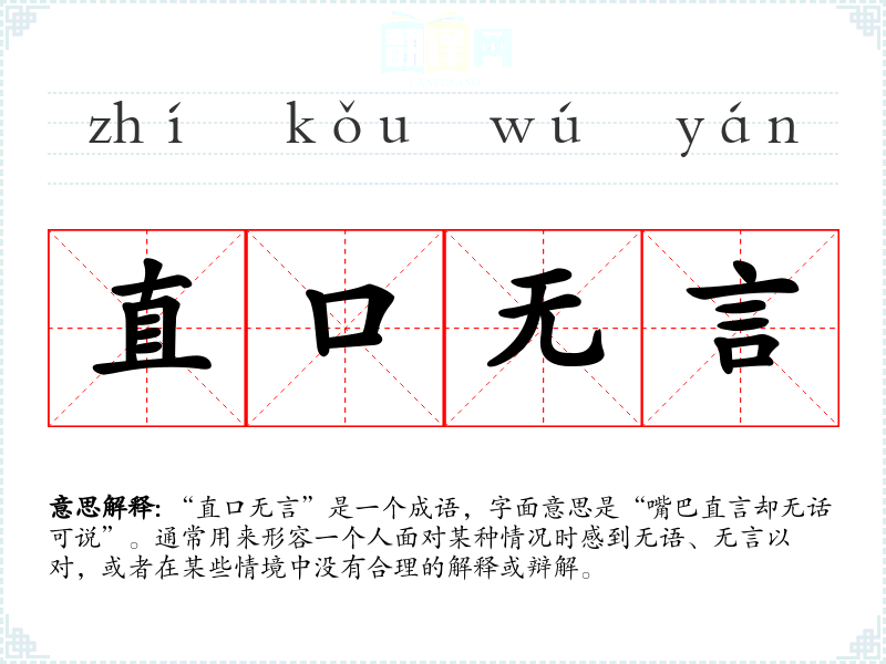 该成语的具体来源不太明确,但从字面上看,可以推测出它与古代汉语中对言语和沟通的重视有关。古代文人往往强调言语的力量与表达的准确性,而“直口无言”则表达了在某种情况下,尽管有直言的冲动,却因无话可说而陷入沉默的状态。