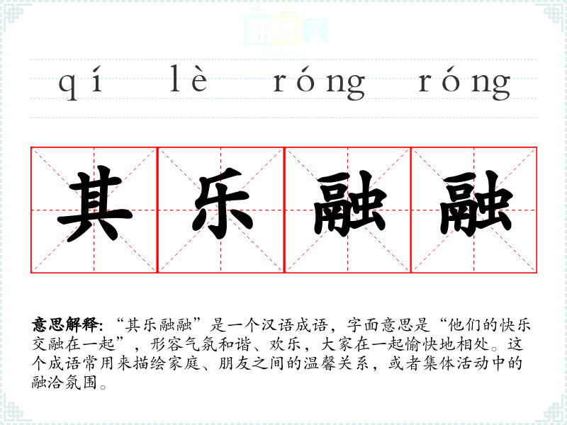 | 其乐融融 | 其:代词,其中的;融融:和乐的样子。形容十分欢乐、和睦。 |