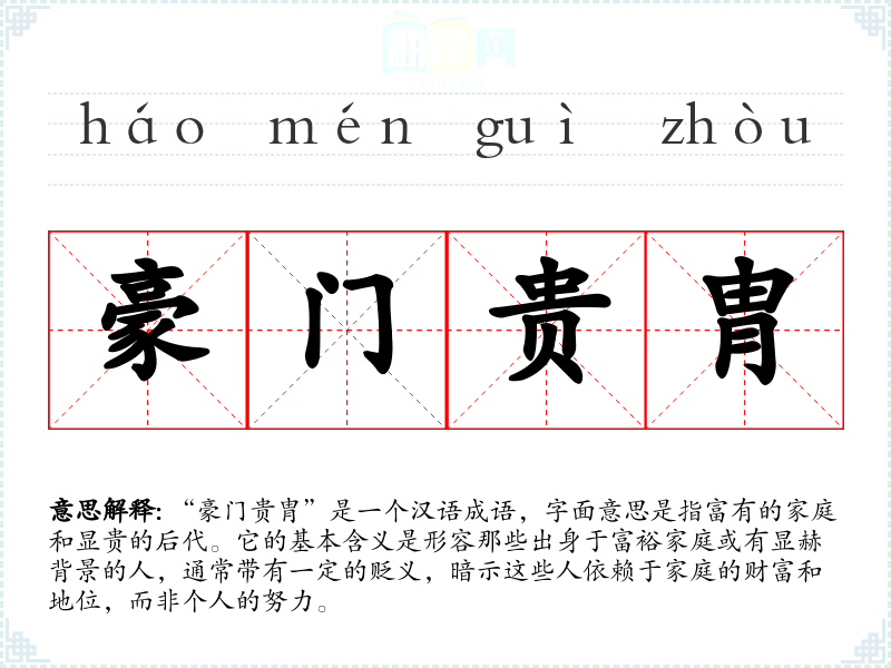 “豪门贵胄”是一个汉语成语,字面意思是指富有的家庭和显贵的后代。它的基本含义是形容那些出身于富裕家庭或有显赫背景的人,通常带有一定的贬义,暗示这些人依赖于家庭的财富和地位,而非个人的努力。