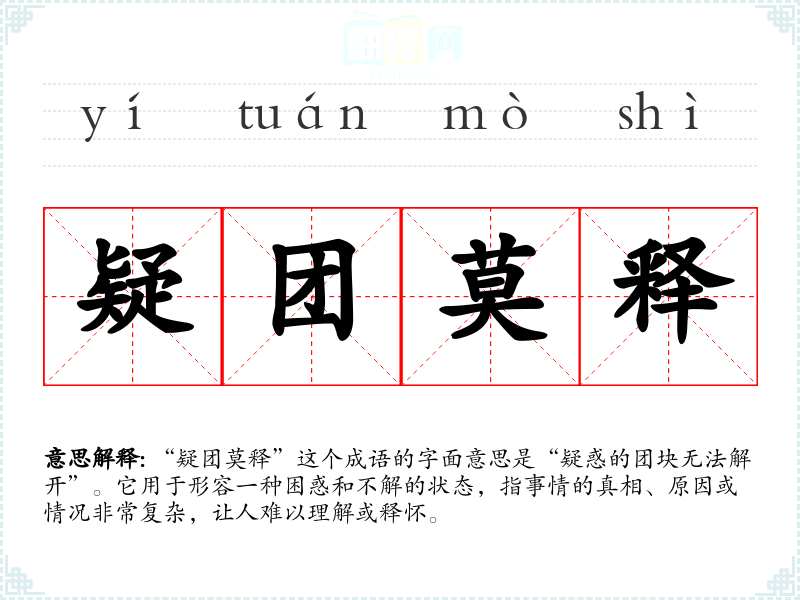 “疑团莫释”这个成语的字面意思是“疑惑的团块无法解开”。它用于形容一种困惑和不解的状态,指事情的真相、原因或情况非常复杂,让人难以理解或释怀。
