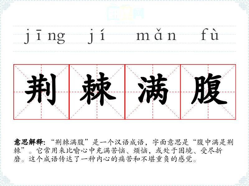 这个成语并没有明确的古典出处,可能是后人在语言表达中逐步形成的。荆棘在古代常被用作比喻困扰与痛苦的象征,因为荆棘刺人,容易让人感到不适。因此,“荆棘满腹”这一表达可以理解为内心被痛苦和烦恼所包围,出自对荆棘的形象联想。