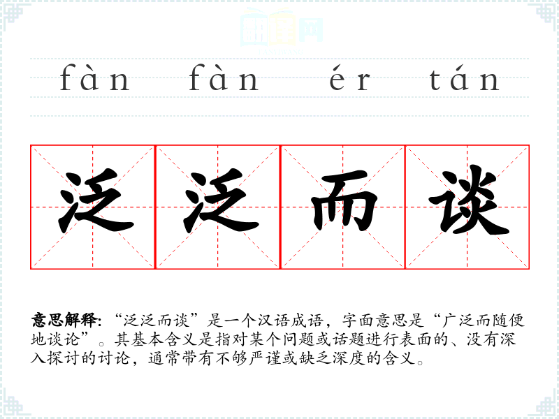“泛泛而谈”是一个汉语成语,字面意思是“广泛而随便地谈论”。其基本含义是指对某个问题或话题进行表面的、没有深入探讨的讨论,通常带有不够严谨或缺乏深度的含义。