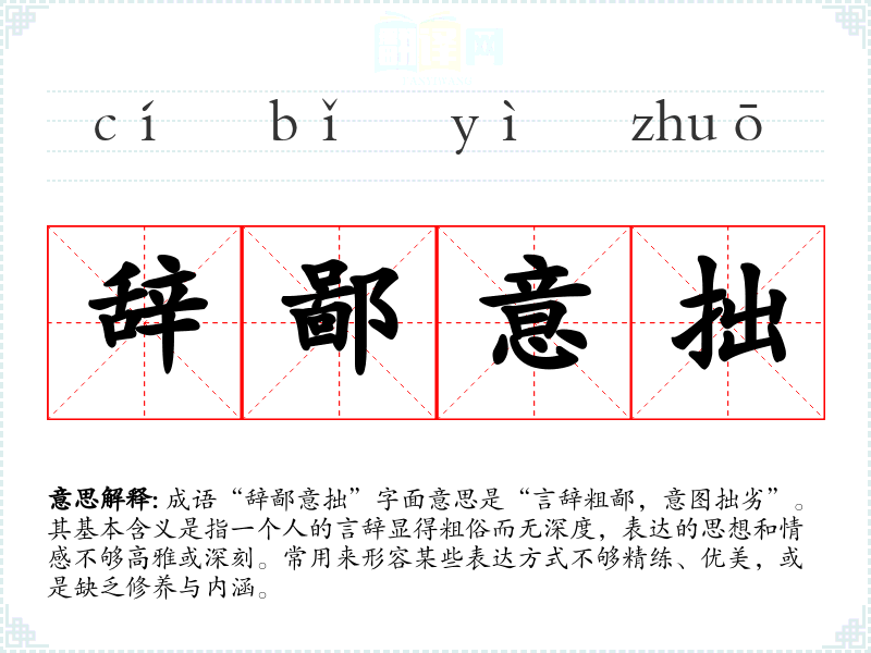 成语“辞鄙意拙”字面意思是“言辞粗鄙,意图拙劣”。其基本含义是指一个人的言辞显得粗俗而无深度,表达的思想和情感不够高雅或深刻。常用来形容某些表达方式不够精练、优美,或是缺乏修养与内涵。