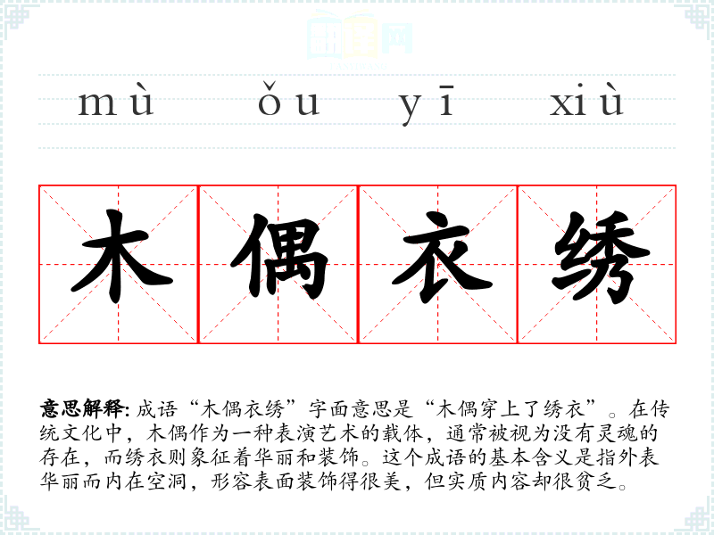 成语“木偶衣绣”字面意思是“木偶穿上了绣衣”。在传统文化中,木偶作为一种表演艺术的载体,通常被视为没有灵魂的存在,而绣衣则象征着华丽和装饰。这个成语的基本含义是指外表华丽而内在空洞,形容表面装饰得很美,但实质内容却很贫乏。