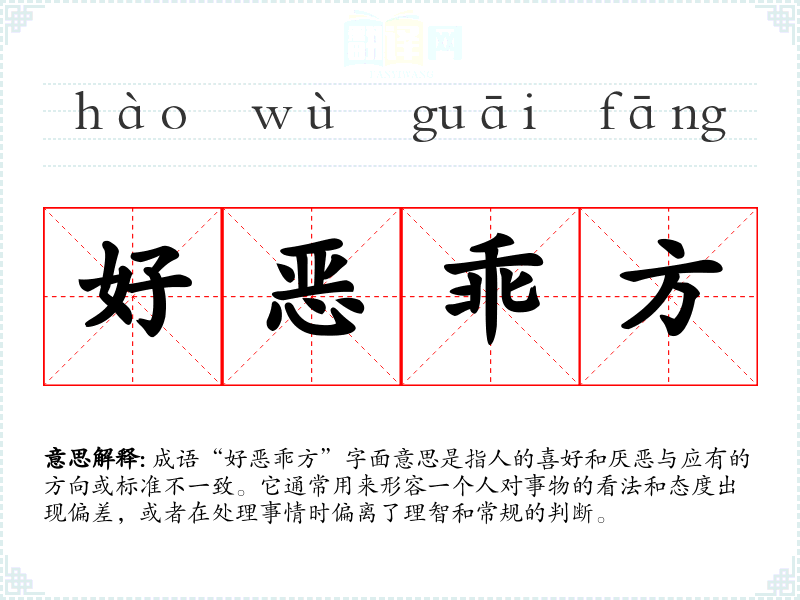 成语“好恶乖方”字面意思是指人的喜好和厌恶与应有的方向或标准不一致。它通常用来形容一个人对事物的看法和态度出现偏差,或者在处理事情时偏离了理智和常规的判断。