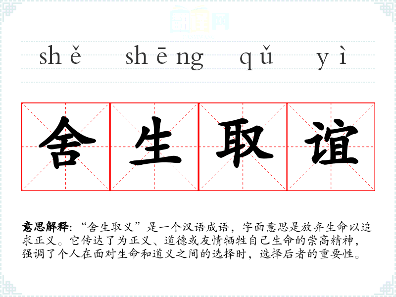 “舍生取义”是一个汉语成语,字面意思是放弃生命以追求正义。它传达了为正义、道德或友情牺牲自己生命的崇高精神,强调了个人在面对生命和道义之间的选择时,选择后者的重要性。