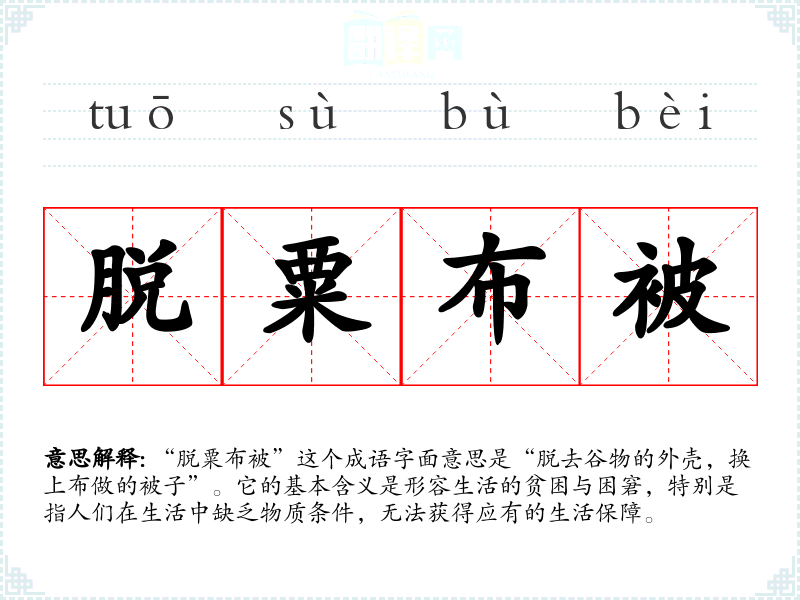 “脱粟布被”这个成语字面意思是“脱去谷物的外壳,换上布做的被子”。它的基本含义是形容生活的贫困与困窘,特别是指人们在生活中缺乏物质条件,无法获得应有的生活保障。