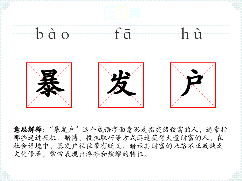 “暴发户”这个成语字面意思是指突然致富的人,通常指那些通过投机、赌博、投机取巧等方式迅速获得大量财富的人。在社会语境中,暴发户往往带有贬义,暗示其财富的来路不正或缺乏文化修养,常常表现出浮夸和炫耀的特征。