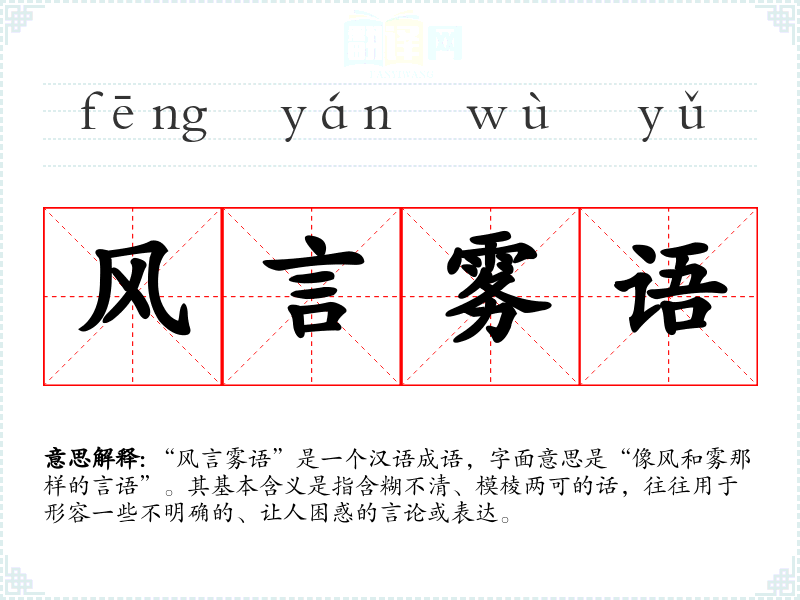 “风言雾语”是一个汉语成语,字面意思是“像风和雾那样的言语”。其基本含义是指含糊不清、模棱两可的话,往往用于形容一些不明确的、让人困惑的言论或表达。