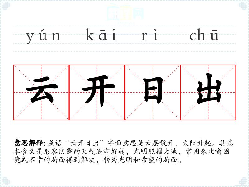 成语“云开日出”字面意思是云层散开,太阳升起。其基本含义是形容阴霾的天气逐渐好转,光明照耀大地,常用来比喻困境或不幸的局面得到解决,转为光明和希望的局面。