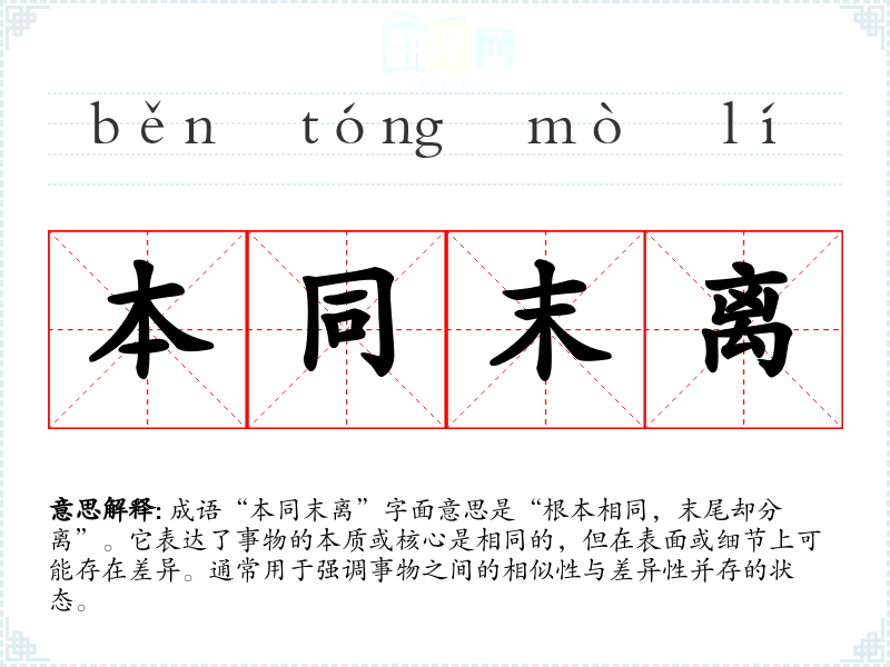 成语“本同末离”字面意思是“根本相同,末尾却分离”。它表达了事物的本质或核心是相同的,但在表面或细节上可能存在差异。通常用于强调事物之间的相似性与差异性并存的状态。