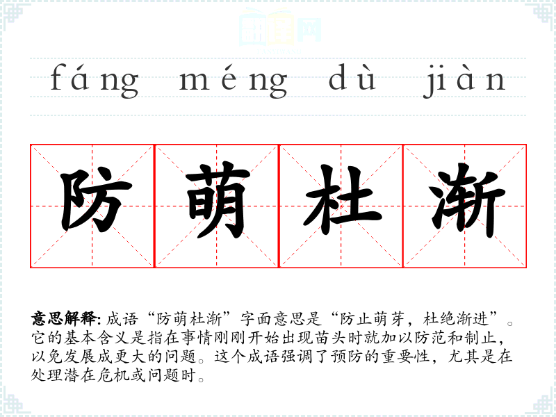 成语“防萌杜渐”字面意思是“防止萌芽,杜绝渐进”。它的基本含义是指在事情刚刚开始出现苗头时就加以防范和制止,以免发展成更大的问题。这个成语强调了预防的重要性,尤其是在处理潜在危机或问题时。
