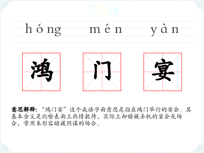 | 鸿门宴 | 鸿门:地名,今陕西临潼东北。指不怀好意的宴请或加害客人的宴会。 |