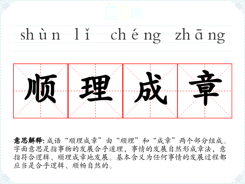 成语“顺理成章”由“顺理”和“成章”两个部分组成。字面意思是指事物的发展合乎道理,事情的发展自然形成章法,意指符合逻辑、顺理成章地发展。基本含义为任何事情的发展过程都应当是合乎逻辑、顺畅自然的。