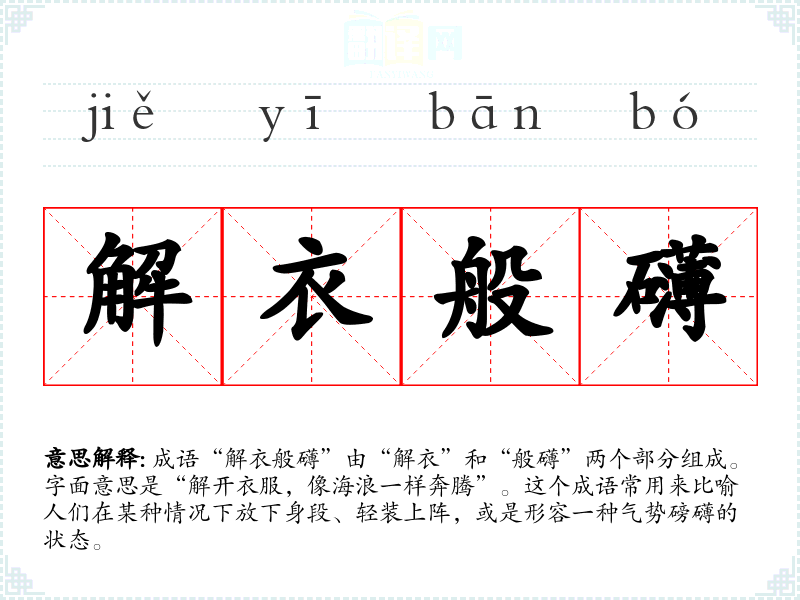 成语“解衣般礴”由“解衣”和“般礴”两个部分组成。字面意思是“解开衣服,像海浪一样奔腾”。这个成语常用来比喻人们在某种情况下放下身段、轻装上阵,或是形容一种气势磅礴的状态。
