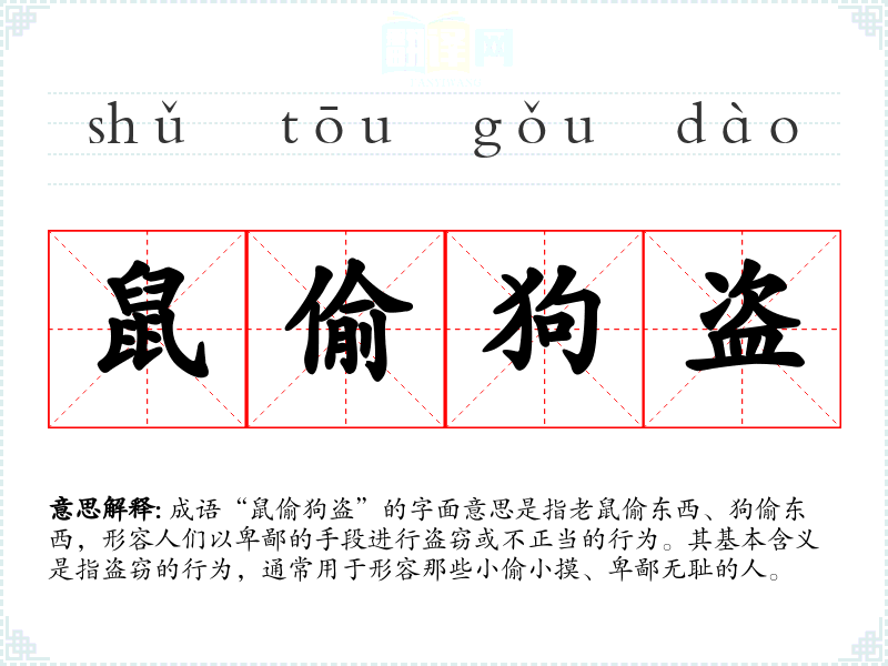 成语“鼠偷狗盗”的字面意思是指老鼠偷东西、狗偷东西,形容人们以卑鄙的手段进行盗窃或不正当的行为。其基本含义是指盗窃的行为,通常用于形容那些小偷小摸、卑鄙无耻的人。