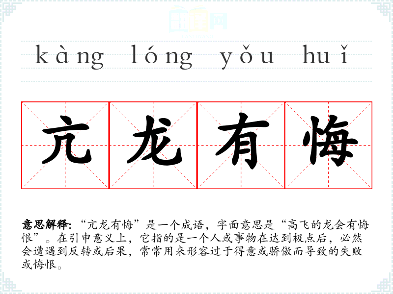 “亢龙有悔”是一个成语,字面意思是“高飞的龙会有悔恨”。在引申意义上,它指的是一个人或事物在达到极点后,必然会遭遇到反转或后果,常常用来形容过于得意或骄傲而导致的失败或悔恨。