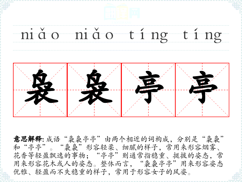 成语“袅袅亭亭”由两个相近的词构成,分别是“袅袅”和“亭亭”。“袅袅”形容轻柔、细腻的样子,常用来形容烟雾、花香等轻盈飘逸的事物;“亭亭”则通常指稳重、挺拔的姿态,常用来形容花木或人的姿态。整体而言,“袅袅亭亭”用来形容姿态优雅、轻盈而不失稳重的样子,常用于形容女子的风姿。