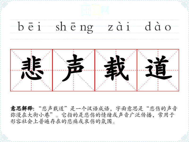 该成语的具体出处不详,但可以推测与古代诗文中描述悲伤情绪的作品有关。在古代文学中,悲伤常常与社会动荡、离别、战乱等情景相结合,因此“悲声载道”也常用来反映历史背景下人们的痛苦和哀伤。