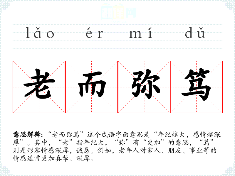 “老而弥笃”这个成语字面意思是“年纪越大,感情越深厚”。其中,“老”指年纪大,“弥”有“更加”的意思,“笃”则是形容情感深厚,诚恳。例如,老年人对家人、朋友、事业等的情感通常更加真挚、深厚。
