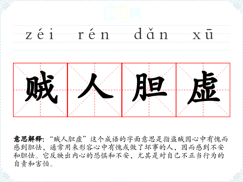 “贼人胆虚”这个成语的字面意思是指盗贼因心中有愧而感到胆怯,通常用来形容心中有愧或做了坏事的人,因而感到不安和胆怯。它反映出内心的恐惧和不安,尤其是对自己不正当行为的自责和害怕。