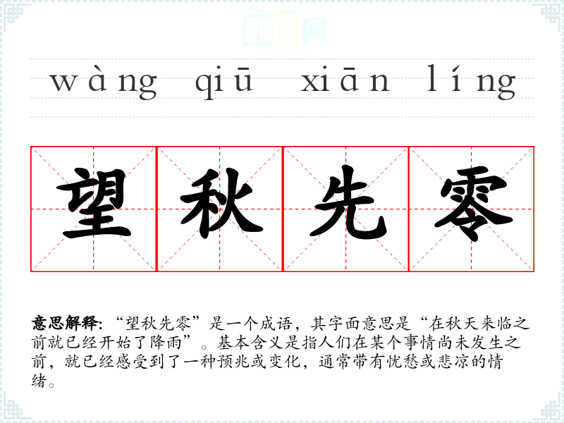 “望秋先零”是一个成语,其字面意思是“在秋天来临之前就已经开始了降雨”。基本含义是指人们在某个事情尚未发生之前,就已经感受到了一种预兆或变化,通常带有忧愁或悲凉的情绪。