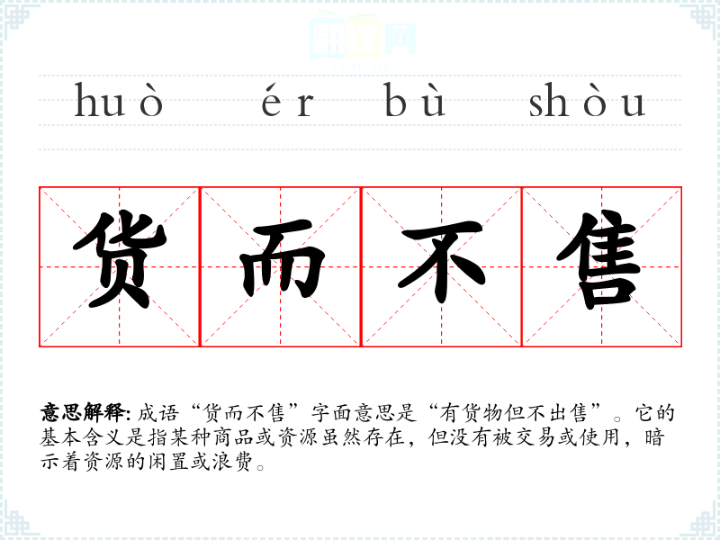 成语“货而不售”字面意思是“有货物但不出售”。它的基本含义是指某种商品或资源虽然存在,但没有被交易或使用,暗示着资源的闲置或浪费。