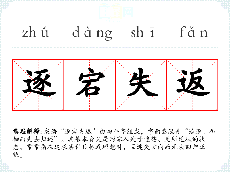 成语“逐宕失返”由四个字组成,字面意思是“追逐、徘徊而失去归还”。其基本含义是形容人处于迷茫、无所适从的状态,常常指在追求某种目标或理想时,因迷失方向而无法回归正轨。