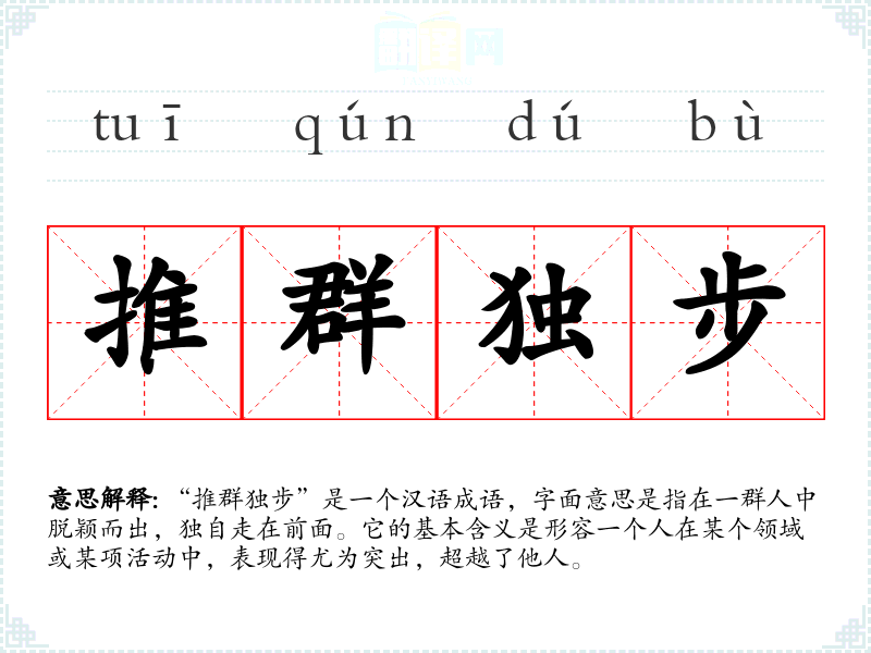 “推群独步”是一个汉语成语,字面意思是指在一群人中脱颖而出,独自走在前面。它的基本含义是形容一个人在某个领域或某项活动中,表现得尤为突出,超越了他人。