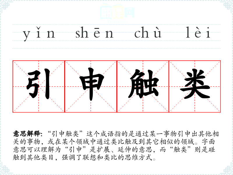 “引申触类”这个成语指的是通过某一事物引申出其他相关的事物,或在某个领域中通过类比触及到其它相似的领域。字面意思可以理解为“引申”是扩展、延伸的意思,而“触类”则是碰触到其他类目,强调了联想和类比的思维方式。