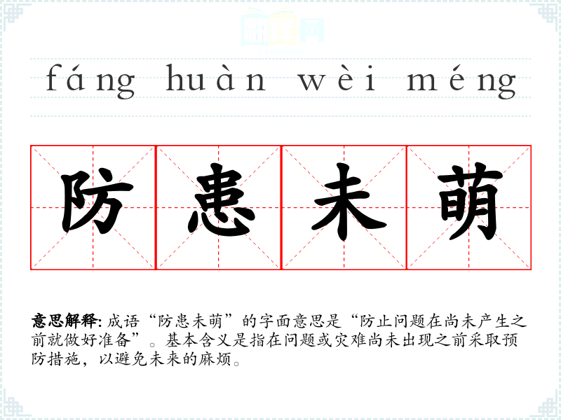 成语“防患未萌”的字面意思是“防止问题在尚未产生之前就做好准备”。基本含义是指在问题或灾难尚未出现之前采取预防措施,以避免未来的麻烦。