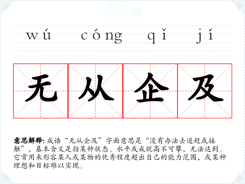 成语“无从企及”字面意思是“没有办法去追赶或接触”,基本含义是指某种状态、水平或成就高不可攀,无法达到。它常用来形容某人或某物的优秀程度超出自己的能力范围,或某种理想和目标难以实现。