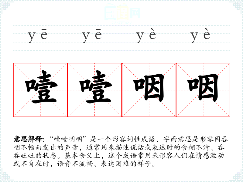 “噎噎咽咽”是一个形容词性成语,字面意思是形容因吞咽不畅而发出的声音,通常用来描述说话或表达时的含糊不清、吞吞吐吐的状态。基本含义上,这个成语常用来形容人们在情感激动或不自在时,语音不流畅、表达困难的样子。