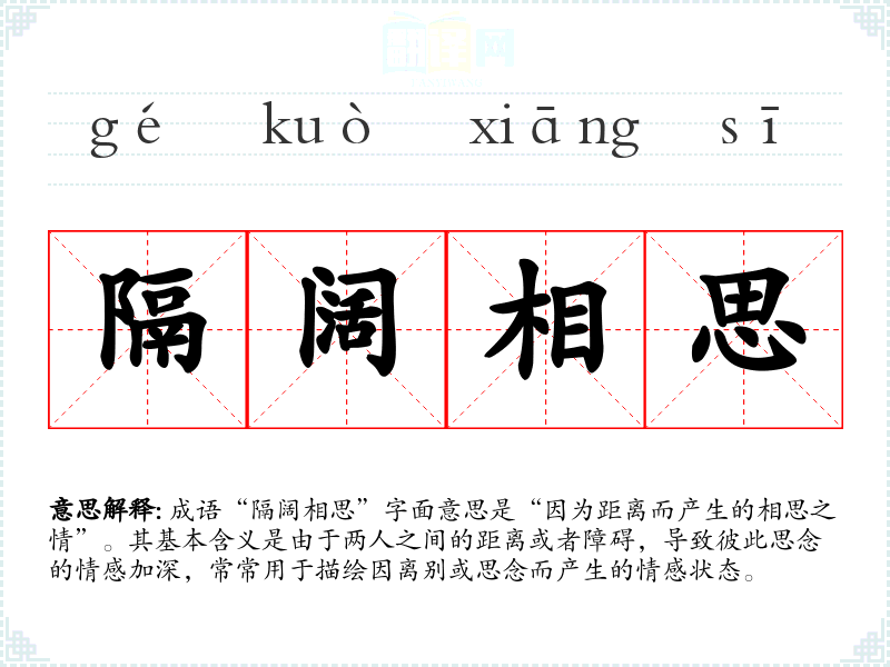 成语“隔阔相思”字面意思是“因为距离而产生的相思之情”。其基本含义是由于两人之间的距离或者障碍,导致彼此思念的情感加深,常常用于描绘因离别或思念而产生的情感状态。