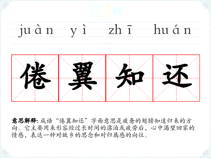 成语“倦翼知还”字面意思是疲惫的翅膀知道归来的方向。它主要用来形容经过长时间的漂泊或疲劳后,心中渴望回家的情感,表达一种对故乡的思念和对归属感的向往。