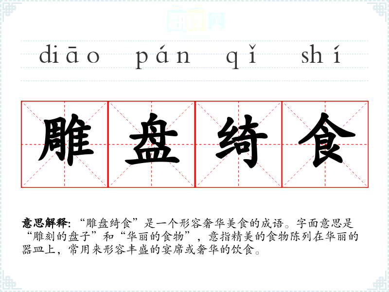 “雕盘绮食”是一个形容奢华美食的成语。字面意思是“雕刻的盘子”和“华丽的食物”,意指精美的食物陈列在华丽的器皿上,常用来形容丰盛的宴席或奢华的饮食。