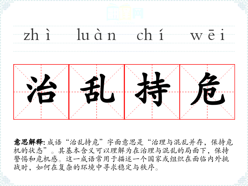 成语“治乱持危”字面意思是“治理与混乱并存,保持危机的状态”。其基本含义可以理解为在治理与混乱的局面下,保持警惕和危机感。这一成语常用于描述一个国家或组织在面临内外挑战时,如何在复杂的环境中寻求稳定与秩序。