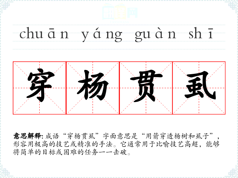 成语“穿杨贯虱”字面意思是“用箭穿透杨树和虱子”,形容用极高的技艺或精准的手法。它通常用于比喻技艺高超,能够将简单的目标或困难的任务一一击破。
