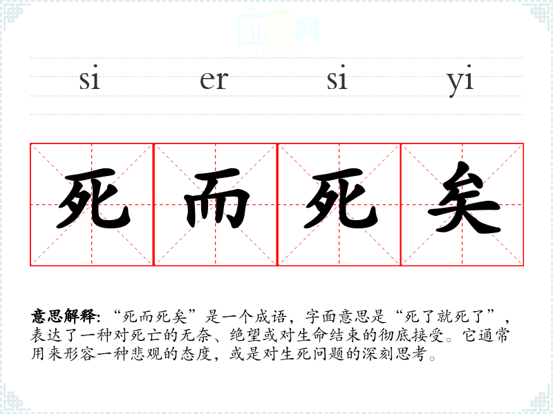 “死而死矣”是一个成语,字面意思是“死了就死了”,表达了一种对死亡的无奈、绝望或对生命结束的彻底接受。它通常用来形容一种悲观的态度,或是对生死问题的深刻思考。