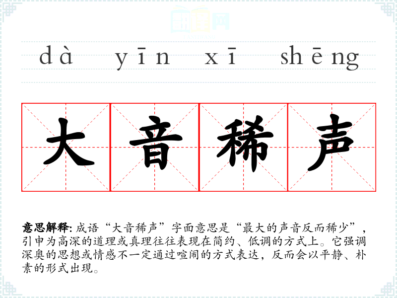 成语“大音稀声”字面意思是“最大的声音反而稀少”,引申为高深的道理或真理往往表现在简约、低调的方式上。它强调深奥的思想或情感不一定通过喧闹的方式表达,反而会以平静、朴素的形式出现。