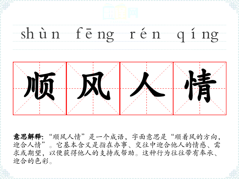 “顺风人情”是一个成语,字面意思是“顺着风的方向,迎合人情”。它基本含义是指在办事、交往中迎合他人的情感、需求或期望,以便获得他人的支持或帮助。这种行为往往带有奉承、迎合的色彩。
