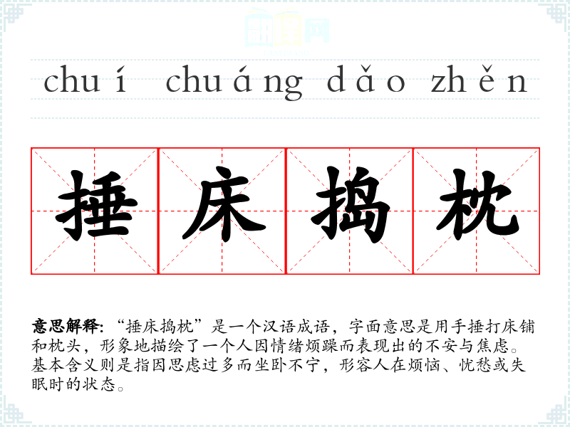 捣枕捶床 烦躁,无奈,气愤或悲痛的样子。形容辗转难以入睡。同“捣枕槌床”。