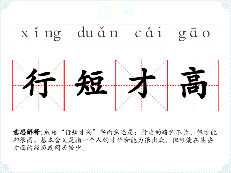 成语“行短才高”字面意思是:行走的路程不长,但才能却很高。基本含义是指一个人的才华和能力很出众,但可能在某些方面的经历或阅历较少。