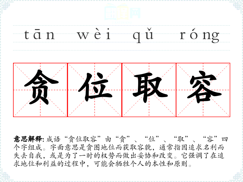 成语“贪位取容”由“贪”、“位”、“取”、“容”四个字组成。字面意思是贪图地位而获取容貌,通常指因追求名利而失去自我,或是为了一时的权势而做出妥协和改变。它强调了在追求地位和利益的过程中,可能会牺牲个人的本性和原则。