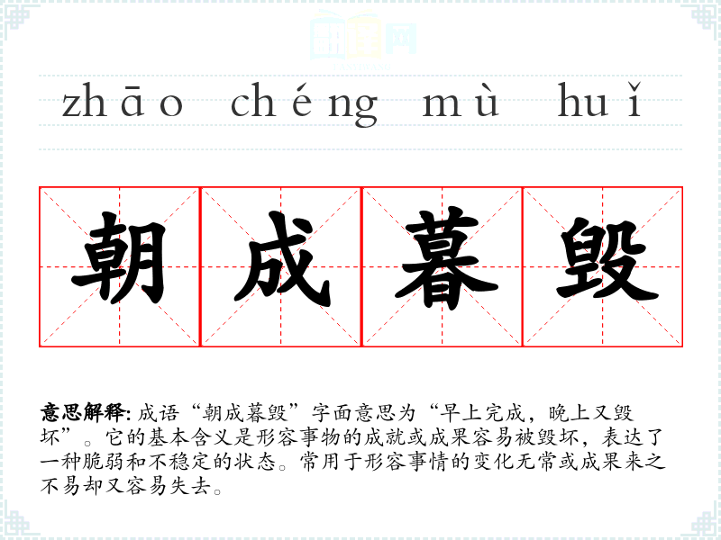 成语“朝成暮毁”字面意思为“早上完成,晚上又毁坏”。它的基本含义是形容事物的成就或成果容易被毁坏,表达了一种脆弱和不稳定的状态。常用于形容事情的变化无常或成果来之不易却又容易失去。