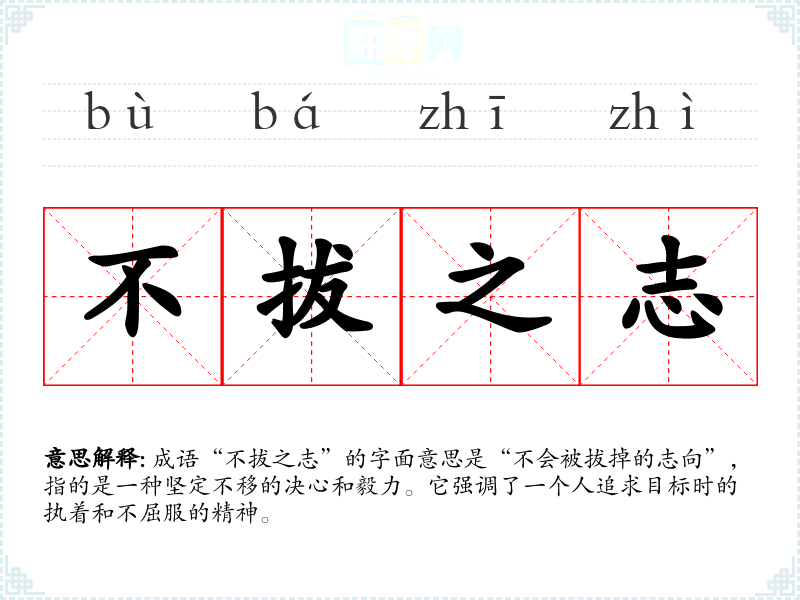 成语“不拔之志”的字面意思是“不会被拔掉的志向”,指的是一种坚定不移的决心和毅力。它强调了一个人追求目标时的执着和不屈服的精神。