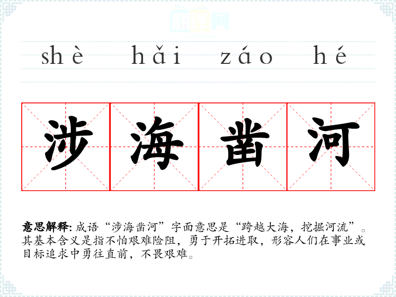 成语“涉海凿河”字面意思是“跨越大海,挖掘河流”。其基本含义是指不怕艰难险阻,勇于开拓进取,形容人们在事业或目标追求中勇往直前,不畏艰难。