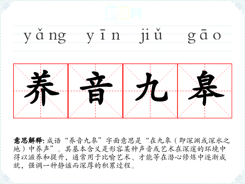 成语“养音九皋”字面意思是“在九皋(即深渊或深水之地)中养声”。其基本含义是形容某种声音或艺术在深邃的环境中得以滋养和提升,通常用于比喻艺术、才能等在潜心修炼中逐渐成就,强调一种静谧而深厚的积累过程。