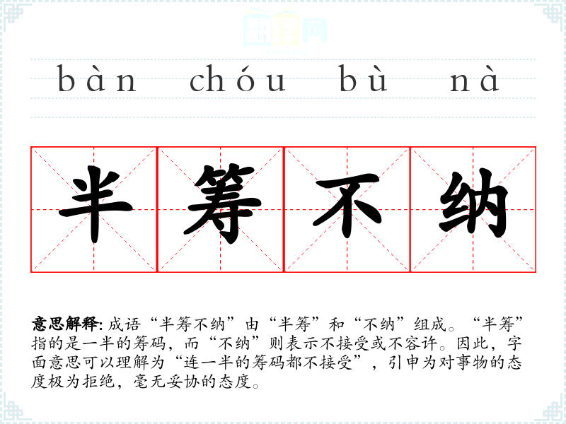 成语“半筹不纳”由“半筹”和“不纳”组成。“半筹”指的是一半的筹码,而“不纳”则表示不接受或不容许。因此,字面意思可以理解为“连一半的筹码都不接受”,引申为对事物的态度极为拒绝,毫无妥协的态度。
